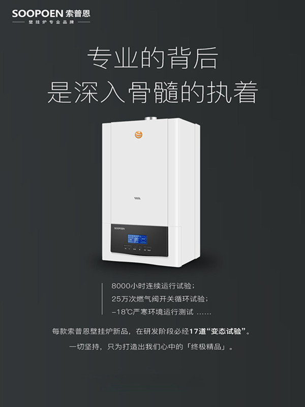索普恩是专业的壁挂炉厂家,它有着多年技术沉淀以及产品改良经验。对生产工艺的控制比较到位,产品故障率很低很低。
